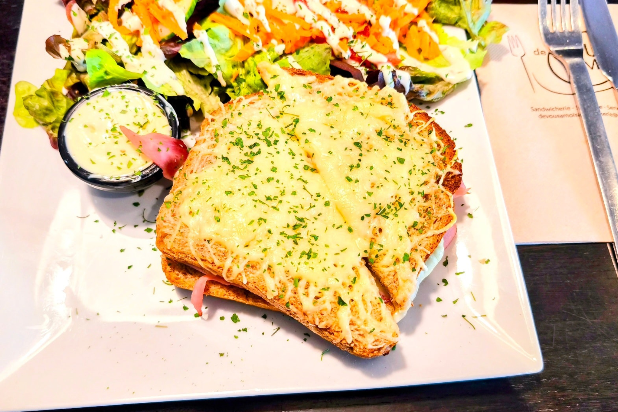 Produit précédent Produit suivant Croque monsieur € 8,50 Croque Monsieur (Facultatif) * Original Ketchup Sans crudités Sans fromage a raceltte Horaires * Lundi au vendredi - de 11h à 14h30 Choisir un mode de retrait * Select an option... A emporter Sur Place quantité de Croque monsieur Ajouter au panier Catégorie : Tout Étiquettes : fromage à raclette, gouda, gruyère., jambon os, Pain gris Marque : Croque Monsieur Description Description Pain gris, jambon os, gouda, fromage à raclette, gruyère. Produits similaires Select options Touttropézien € 6,90 Select options ToutPâtes chèvre € 8,50 Select options Toutfinlandais € 7,50